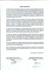 Les institutions, ainsi que les organisations internationales, notamment l'ONU, prennent position et condamnent fortement l'état français[5] et « demande au Gouvernement français de se retirer immédiatement de l’île comorienne de Mayotte, partie intégrante de la République indépendante des Comores, et de respecter sa souveraineté ».