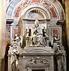 | 8 | Urbain VIII | 1623-1644 | 235e pape | ? | Inhumé dans un monument construit par Gian Lorenzo Bernini avec un schéma pyramidal similaire à la tombe du pape Paul III. Un grand piédestal de marbre blanc soutient la figure en bronze du pape bénissant. Les allégories de la charité avec des enfants et de la justice avec une épée et une échelle, l'entoure en contrebas. Le monument est achevé en 1647. | ![]() |