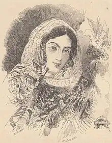En à Paris, a lieu en grande pompe l'enterrement de Malka Kachwar[alpha 4], reine d'Oude, au cimetière du Père-Lachaise[9]. Nélie Jacquemart, qui accompagne Léon Cogniet, réalise de nombreux croquis des personnages présents. Aristide Merille du journal L'Illustration fait réaliser des lithographies par d'Évremond de Bérard et Jules Worms d'après ses croquis. Le , l'article sur « Les funérailles de la reine d'Oude », accompagné d'une double page centrale illustrée de dix lithographies avec pour certaines l'attribution « d'après les croquis de Mlle Nélie Jacquemard », est publié dans le journal[10],[11].