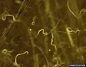 Les nématodes foliaires ont besoin d'eau pour se mouvoir et se disperser à la surface des feuilles. Il profitent des films d'eau résultant de la pluie, de la rosée ou de l'irrigation par aspersion. Ils pénètrent dans les feuilles et sortent du tissu foliaire par les stomates situés à la face inférieure des feuilles. Les nématodes foliaires sont attirés par le stimulus tactile des stomates en forme de fente. Ils ne sont pas attirés par l'oxygène, mais par le dioxyde de carbone gazeux, émis par les stomates la nuit du fait de la respiration cellulaire dans la plante. La nuit est plus favorable à la présence d'un film de rosée sur la surface des feuilles qui facilite la migration des nématodes vers les stomates[1].