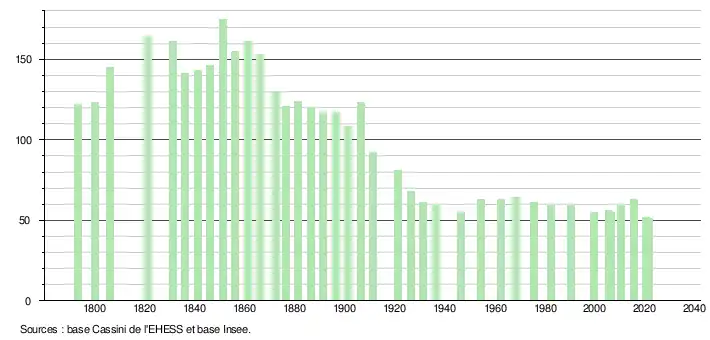 | L'évolution du nombre d'habitants est connue à travers les recensements de la population effectués dans la commune depuis 1793. Pour les communes de moins de 10 000 habitants, une enquête de recensement portant sur toute la population est réalisée tous les cinq ans, les populations légales des années intermédiaires étant quant à elles estimées par interpolation ou extrapolation[30]. Pour la commune, le premier recensement exhaustif entrant dans le cadre du nouveau dispositif a été réalisé en 2005[31]. En 2021, la commune comptait 51 habitants[Note 4], en diminution de 19,05 % par rapport à 2015 (Haute-Garonne : +7,43 %, France hors Mayotte : +1,84 %). |