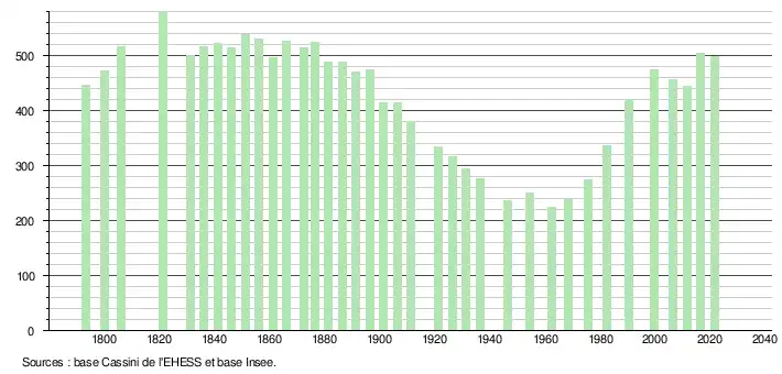 L'évolution du nombre d'habitants est connue à travers les recensements de la population effectués dans la commune depuis 1793. Pour les communes de moins de 10 000 habitants, une enquête de recensement portant sur toute la population est réalisée tous les cinq ans, les populations légales des années intermédiaires étant quant à elles estimées par interpolation ou extrapolation[25]. Pour la commune, le premier recensement exhaustif entrant dans le cadre du nouveau dispositif a été réalisé en 2006[26].
