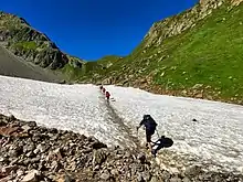 Des randonneurs empruntant un névé alpin.
