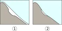 En hiver, la neige s'accumule sur toute la montagne (1). Lorsque la neige fond, au printemps ou en été, la partie protégée par le relief du terrain ne fond pas aussi vite que le reste et crée un névé (2).