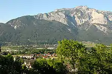 La place principale, en arrière-plan le massif du Dobratsch. | |