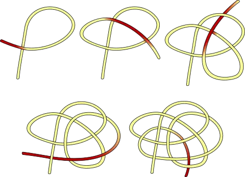 Dans le schéma d'entrelacement du nœud de piton, on voit apparaître un empilement d'anses. Chaque ligne rouge passe par une anse. Dans le cas d'un empilement, on peut trouver plusieurs anses sur la même ligne.