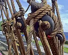Nœuds de ride sur les caps de mouton de bas hauban de L'Hermione à Rochefort (Charente Maritime)