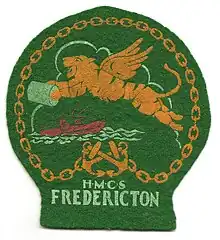 Le Fredericton a été construit pour un équipage de 85 personnes incluant 5 officiers et le commandant. Du au il a été commandé par le capitaine de corvette intérimaire J.H.S. MacDonald du RCNR. Du au , il a été commandé par le LCdr J.E. Harrington du RCNVR et enfin, le lieutenant J.C. Smythe du MRC l'a commandé à partir du jusqu'à son désarmement le [4].