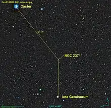 La nébuleuse NGC 2371 est située à environ 1,7 degré presque directement au nord d'Iota Geminorum. L'étoile Castor est également dans la même région du ciel à quelque 3,1 degrés au nord-est de NGC 2371.