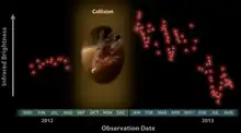 Les astronomes ont été surpris de voir dans les données du télescope spatial Spitzer une forte augmentation de la l'intensité de la lumière infrarouge dans le voisinage immédiat de l'étoile NGC 2547-ID8 qui s'est produite entre le mois d' et celui de (voir le graphique).