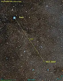 La nébuleuse NGC 6881 est située à environ 3,6 degrés au sud-ouest de l'étoile Sadr (Gamma Cygni).