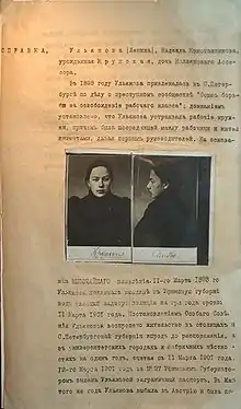 Nadejda Konstantinovna Kroupskaïa (en russe : Надежда Константиновна Крупская), née à Saint-Pétersbourg le 14 février 1869 ( dans le calendrier grégorien) et morte à Moscou le , était l'épouse de Lénine. Pédagogue de métier (docteur en éducation[1]), elle est surtout connue en tant que militante bolchévique et collaboratrice politique de son époux.