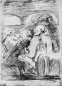(Les curés et les frères s'envoient de solides gorgées quand personne ne les voit ; mais le monde le sait bien. Le verre de l'abbé est un bon indice pour indiquer le désordre que l'on trouve chez le clerc)[5].
