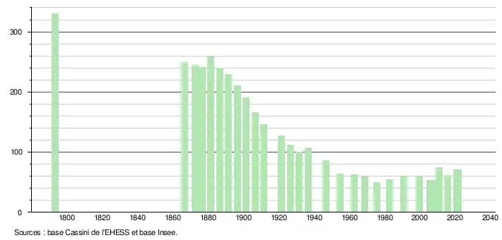 L'évolution du nombre d'habitants est connue à travers les recensements de la population effectués dans la commune depuis 1793. Pour les communes de moins de 10 000 habitants, une enquête de recensement portant sur toute la population est réalisée tous les cinq ans, les populations légales des années intermédiaires étant quant à elles estimées par interpolation ou extrapolation[37]. Pour la commune, le premier recensement exhaustif entrant dans le cadre du nouveau dispositif a été réalisé en 2005[38].