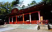 - haiden (拝殿) : bâtiment consacré au culte datant de la 12e année de l’ère Eiroku (1569). C’est à cet endroit que les fidèles obtiennent une purification et viennent prier ;