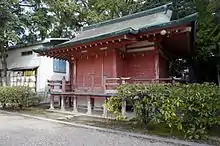 - honden (本殿) : littéralement « bâtiment principal », sa construction date de l’ère Genroku (1688-1704). Il représente l’endroit le plus sacré du sanctuaire où est conservé un objet pouvant accueillir une divinité appelé « go shinta i » (御神体). Généralement fermé au grand public, cet espace est délimité par une clôture (tamagaki, 玉垣) ;
