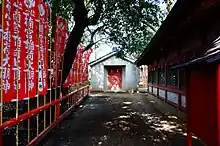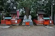 Derrière le bâtiment principal, un espace délimité par un suigaki (透垣, clôture avec des planches en bois espacées) abrite un autre sanctuaire auxiliaire bien plus imposant que les autres et dédié à la divinité Inari (稲荷神) nommé Kusumiya Inarisha (楠宮稲荷社). En arpentant le couloir gauche, le visiteur parvient à un étrange bâtiment semblant être à l’écart du lieu de culte. Cet édifice assez petit aux murs gris clair, au toit vert foncé où trône une tête de démon entourée de tuiles (onigawara, 鬼瓦), ayant une porte rouge (fermée par un verrou) où est accrochée au-dessus une corde sacrée (shimenawa, 注連縄) porte le nom d’oni muro (鬼室, pièce des démons) et est utilisé lors de la journée particulière de la veille du printemps du calendrier lunaire.