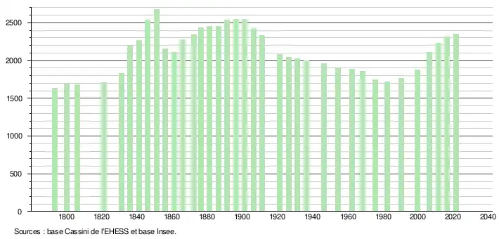 L'évolution du nombre d'habitants est connue à travers les recensements de la population effectués dans la commune depuis 1793. Pour les communes de moins de 10 000 habitants, une enquête de recensement portant sur toute la population est réalisée tous les cinq ans, les populations légales des années intermédiaires étant quant à elles estimées par interpolation ou extrapolation[19]. Pour la commune, le premier recensement exhaustif entrant dans le cadre du nouveau dispositif a été réalisé en 2006[20].