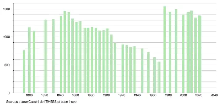 L'évolution du nombre d'habitants est connue à travers les recensements de la population effectués dans la commune depuis 1793. Pour les communes de moins de 10 000 habitants, une enquête de recensement portant sur toute la population est réalisée tous les cinq ans, les populations légales des années intermédiaires étant quant à elles estimées par interpolation ou extrapolation[30]. Pour la commune, le premier recensement exhaustif entrant dans le cadre du nouveau dispositif a été réalisé en 2005[31].