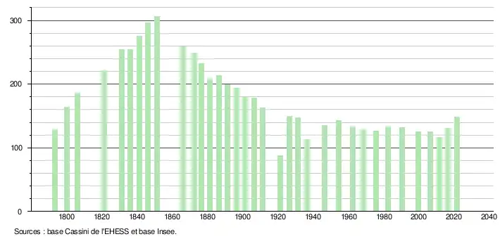 L'évolution du nombre d'habitants est connue à travers les recensements de la population effectués dans la commune depuis 1793. Pour les communes de moins de 10 000 habitants, une enquête de recensement portant sur toute la population est réalisée tous les cinq ans, les populations légales des années intermédiaires étant quant à elles estimées par interpolation ou extrapolation[18]. Pour la commune, le premier recensement exhaustif entrant dans le cadre du nouveau dispositif a été réalisé en 2006[19].