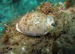 Cette porcelaine vit cachée la journée, le manteau rentré dans la coquille. Elle sort de nuit pour se nourrir, principalement d'algues qu'elle broute au moyen de sa radula, le manteau lui permettant de se camoufler et de percevoir son environnement[1].