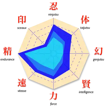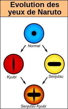 | Yeux | Bleus (rouges en « mode Kyûbi », jaunes en « mode Ermite », oranges avec les deux modes combinés) |