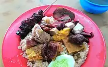 Les communautés de Chinois d'Indonésie connaissent une autre variante, le nasi campur tionghoa[6], qui est un assortiment de viandes grillées, telles que le char siew, des saucisses de porc ou encore des sate de porc. Ce plat est habituellement servi avec une soupe de poulet ou du sayur asin, un bouillon clair d'os de porc avec des graines de moutarde verte fermentées.