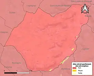 Le retrait-gonflement des sols argileux est susceptible d'engendrer des dommages importants aux bâtiments en cas d’alternance de périodes de sécheresse et de pluie. La totalité de la commune est en aléa moyen ou fort (67,4 % au niveau départemental et 48,5 % au niveau national). Sur les 285 bâtiments dénombrés sur la commune en 2019, 285 sont en aléa moyen ou fort, soit 100 %, à comparer aux 84 % au niveau départemental et 54 % au niveau national. Une cartographie de l'exposition du territoire national au retrait gonflement des sols argileux est disponible sur le site du BRGM[23],[Carte 2].