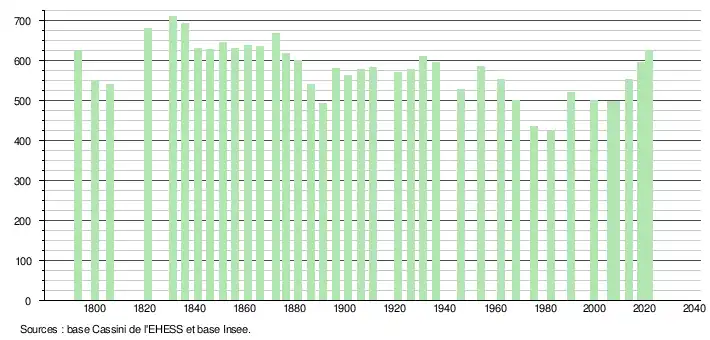 | L'évolution du nombre d'habitants est connue à travers les recensements de la population effectués dans la commune depuis 1793. Pour les communes de moins de 10 000 habitants, une enquête de recensement portant sur toute la population est réalisée tous les cinq ans, les populations légales des années intermédiaires étant quant à elles estimées par interpolation ou extrapolation[31]. Pour la commune, le premier recensement exhaustif entrant dans le cadre du nouveau dispositif a été réalisé en 2008[32]. En 2021, la commune comptait 626 habitants[Note 4], en augmentation de 13,82 % par rapport à 2015 (Gironde : +6,88 %, France hors Mayotte : +1,84 %). |