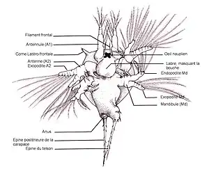 Le nauplius est un organisme de petite taille (longueur de l’ordre du millimètre), de forme assez variable selon les espèces, typiquement ovoïde ou pyriforme[2]. La région antérieure (partie antérieure de la tête ou céphalon) possède un œil impair, dit simple, appelé œil nauplien. Elle est équipée de trois paires d’appendices :