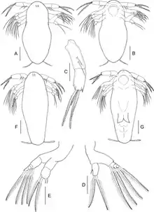 Les antennes et les mandibules sont équipées de soies plumeuses qui leur permettent d’avoir une grande portance sur l’eau et la locomotion est assurée par de brusques mouvements de ces appendices vers l’arrière ce qui donne une allure saccadée très caractéristique aux déplacements des nauplius.