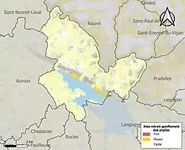 Le retrait-gonflement des sols argileux est susceptible d'engendrer des dommages importants aux bâtiments en cas d’alternance de périodes de sécheresse et de pluie. 2,3 % de la superficie communale est en aléa moyen ou fort (15,8 % au niveau départemental et 48,5 % au niveau national). Sur les 216 bâtiments dénombrés sur la commune en 2019, aucun n'est en aléa moyen ou fort, à comparer aux 14 % au niveau départemental et 54 % au niveau national. Une cartographie de l'exposition du territoire national au retrait gonflement des sols argileux est disponible sur le site du BRGM[21],[Carte 1].