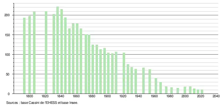 L'évolution du nombre d'habitants est connue à travers les recensements de la population effectués dans la commune depuis 1793. Pour les communes de moins de 10 000 habitants, une enquête de recensement portant sur toute la population est réalisée tous les cinq ans, les populations légales des années intermédiaires étant quant à elles estimées par interpolation ou extrapolation[18]. Pour la commune, le premier recensement exhaustif entrant dans le cadre du nouveau dispositif a été réalisé en 2006[19].