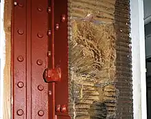 Les navires construits à base de fer utilisaient le bois pour leur protection. Le HMS Warrior était protégé par 114 mm de fer forgé renforcé par 381 mm de teck, qui est le bois de construction le plus résistant[51]. Le bois jouait deux rôles : protéger des éclats et empêcher un tir direct sur la structure du navire. Plus tard, le bois et le fer furent combinés en 'sandwich' pour réaliser des blindages plus résistants comme ce fut le cas sur le HMS Inflexible[52].