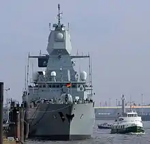 Vue frontale du Hamburg, une frégate de la classe Sachsen de la marine allemande.