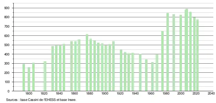 L'évolution du nombre d'habitants est connue à travers les recensements de la population effectués dans la commune depuis 1793. Pour les communes de moins de 10 000 habitants, une enquête de recensement portant sur toute la population est réalisée tous les cinq ans, les populations légales des années intermédiaires étant quant à elles estimées par interpolation ou extrapolation[23]. Pour la commune, le premier recensement exhaustif entrant dans le cadre du nouveau dispositif a été réalisé en 2007[24].