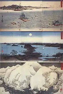 La série Neige et lune de Hiroshige comprend en particulier plusieurs triptyques de paysages célèbres, peints par Hiroshige en 1857.
