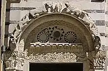 Les tympans des portails du dôme de Carrare conservent d'intéressantes mosaïques bichromes réalisées avec des tesselles, entre autres, de nero di colonnata.