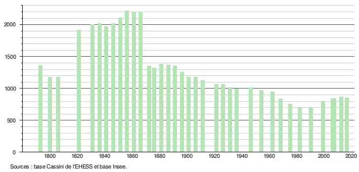 L'évolution du nombre d'habitants est connue à travers les recensements de la population effectués dans la commune depuis 1793. Pour les communes de moins de 10 000 habitants, une enquête de recensement portant sur toute la population est réalisée tous les cinq ans, les populations légales des années intermédiaires étant quant à elles estimées par interpolation ou extrapolation[8]. Pour la commune, le premier recensement exhaustif entrant dans le cadre du nouveau dispositif a été réalisé en 2007[9].
