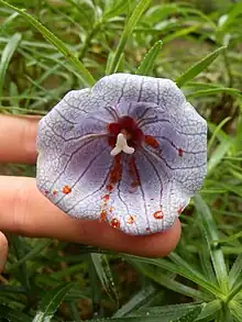 Les fleurs sont solitaires à l'aisselle des feuilles supérieures et penchées. La corolle est campanulée, à lobes réfléchis, longs d'environ 8 mm, bleu pâle, veinée de bleu violet et à cinq taches orange, un peu gibbeuse à la base, glabre à l'extérieur, poilue à l'intérieur dans la partie inférieure[3].