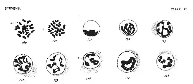 « Cependant, d'ordinaire, le spirème irrégulier et enchevêtré (fig. 173 et 174) se condense en une bande fortement segmentée disposée de diverses façons dans le noyau (fig. 177). Cette bande se fractionne rapidement en chromosomes bivalents montrés sur les figures 178 et 179, donnant 9 paires symétriques et une paire asymétrique, composée du petit chromosome et d'un plus grand. En prophase du fuseau, dans de rares cas, certains chromosomes sont clivés longitudinalement et condensés transversalement, formant des tétrades (fig. 180). Mais la plupart du temps, ils apparaissent comme dans la figure 181. La paire asymétrique qui apparaît dans chaque figure est marquée « s ». Elle est la dernière à s'aligner sur la plaque équatoriale en métaphase (fig. 182), peut-être en raison de son manque de symétrie. Le petit composant de cette paire est toujours dirigé vers l'équateur du fuseau. La figure 183 montre une coupe tangentielle d'un fuseau en métaphase contenant une paire inégale et une paire égale.