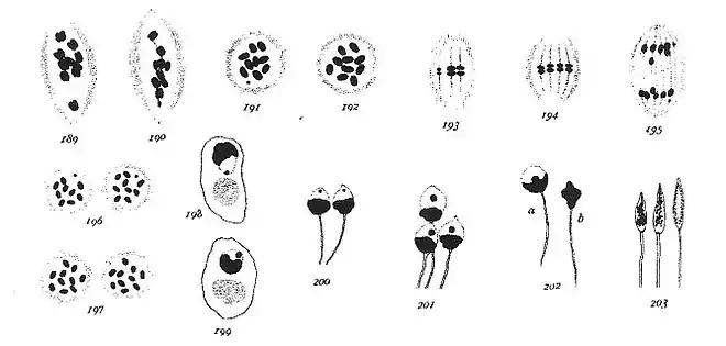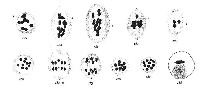 Dans la figure 184, la vue polaire d'une métaphase est montrée. La paire inégale est un peu décalée par rapport aux autres. Les figures 184a et 185 montrent que les composants inégaux de la paire asymétrique, ainsi que les composants égaux des paires symétriques, sont séparés en métakinèse, manifestant clairement une division de réduction. Deux plaques polaires sont montrées dans les figures 186 et 187, l'une contenant 10 éléments égaux et l'autre contenant 9 éléments égaux et un petit. La télophase est montrée à la figure 188. Il n'y a pas d'étape de repos. Le nouveau fuseau est formé des restes du précédent, et la masse de la chromatine en forme de fuseau, vue à la figure 188, ou bien passe dans le centre du nouveau fuseau ou bien est enveloppée par lui. Les chromosomes doubles se séparent comme dans les figures 189 et 190. »