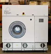 Une machine pour le nettoyage à sec ressemble à une machine à laver, mais elle est plus grande et fonctionne en circuit fermé : le solvant est récupéré, filtré (filtres à charbon actif) et réutilisé pendant le cycle de lavage au lieu d’être rejeté dans les canalisations.