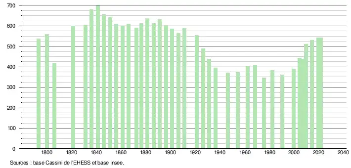 L'évolution du nombre d'habitants est connue à travers les recensements de la population effectués dans la commune depuis 1793. Pour les communes de moins de 10 000 habitants, une enquête de recensement portant sur toute la population est réalisée tous les cinq ans, les populations légales des années intermédiaires étant quant à elles estimées par interpolation ou extrapolation[28]. Pour la commune, le premier recensement exhaustif entrant dans le cadre du nouveau dispositif a été réalisé en 2004[29].