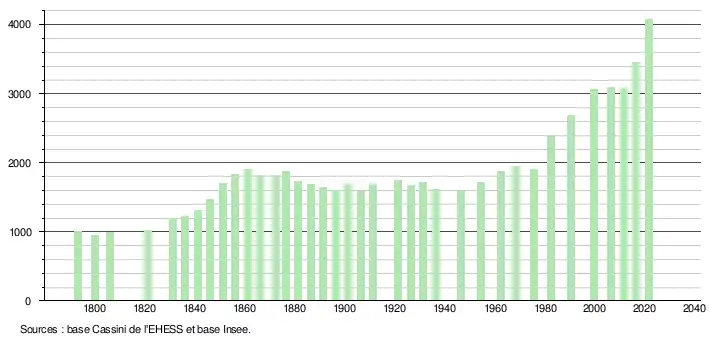 L'évolution du nombre d'habitants est connue à travers les recensements de la population effectués dans la commune depuis 1793. Pour les communes de moins de 10 000 habitants, une enquête de recensement portant sur toute la population est réalisée tous les cinq ans, les populations légales des années intermédiaires étant quant à elles estimées par interpolation ou extrapolation[28]. Pour la commune, le premier recensement exhaustif entrant dans le cadre du nouveau dispositif a été réalisé en 2006[29].