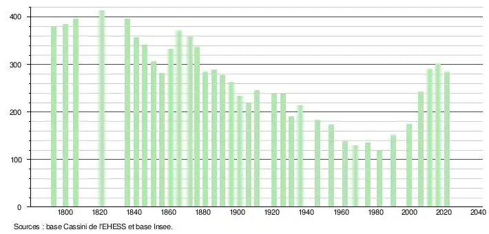 L'évolution du nombre d'habitants est connue à travers les recensements de la population effectués dans la commune depuis 1793. Pour les communes de moins de 10 000 habitants, une enquête de recensement portant sur toute la population est réalisée tous les cinq ans, les populations légales des années intermédiaires étant quant à elles estimées par interpolation ou extrapolation[21]. Pour la commune, le premier recensement exhaustif entrant dans le cadre du nouveau dispositif a été réalisé en 2006[22].