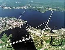 Un pont sur la Neuse à New Bern, au confluent de la Trent (en) (en bas de la photo).