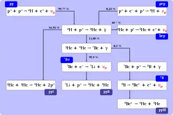 Cette réaction produit 14 % des neutrinos solaires. Le lithium 7 se combinera avec un proton pour produire 2 noyaux d'hélium 4.
