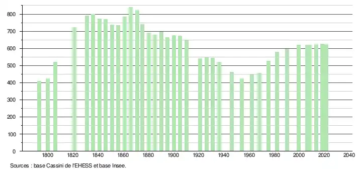 L'évolution du nombre d'habitants est connue à travers les recensements de la population effectués dans la commune depuis 1793. Pour les communes de moins de 10 000 habitants, une enquête de recensement portant sur toute la population est réalisée tous les cinq ans, les populations légales des années intermédiaires étant quant à elles estimées par interpolation ou extrapolation[17]. Pour la commune, le premier recensement exhaustif entrant dans le cadre du nouveau dispositif a été réalisé en 2008[18].