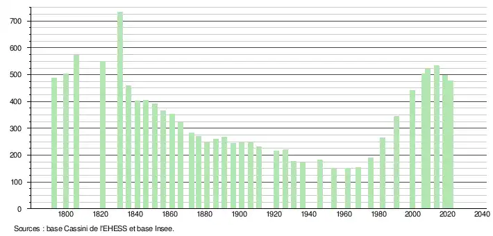L'évolution du nombre d'habitants est connue à travers les recensements de la population effectués dans la commune depuis 1793. Pour les communes de moins de 10 000 habitants, une enquête de recensement portant sur toute la population est réalisée tous les cinq ans, les populations légales des années intermédiaires étant quant à elles estimées par interpolation ou extrapolation[24]. Pour la commune, le premier recensement exhaustif entrant dans le cadre du nouveau dispositif a été réalisé en 2008[25].